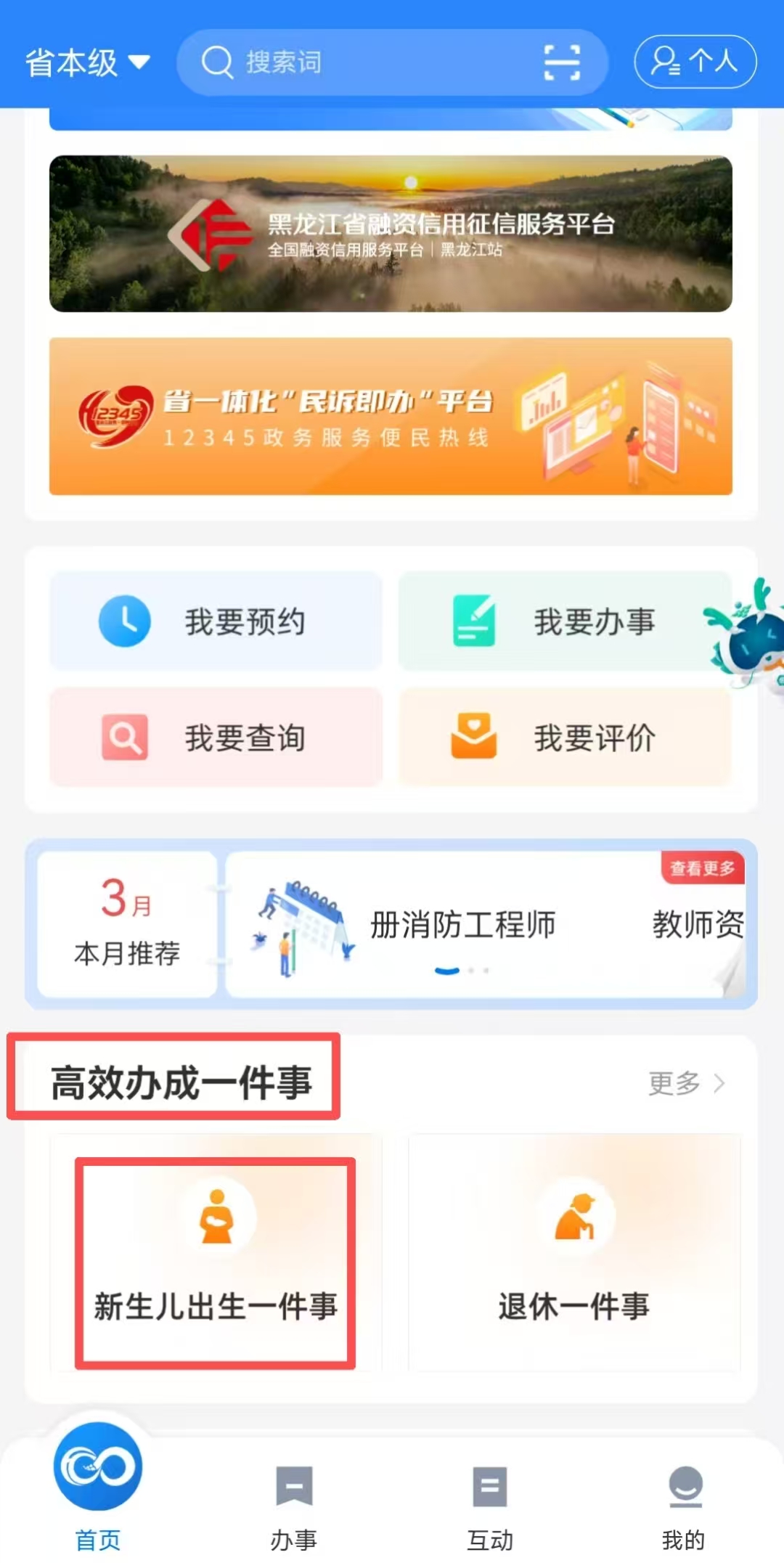 注册登录“龙易办”APP,在首页下滑高效办成一件事中选择“新生儿出生一件事”,点击进入主题页面。