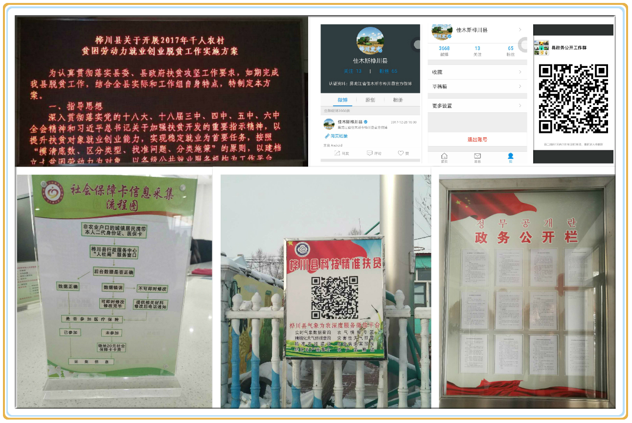 (三)突出形式创新,“互联网+政务服务”加快推进。加快提高政务公开信息化能力,重点构建以“一栏一屏一网”为核心的政务公开体系,共建成政务公开栏1054个,安装电子显示屏、触摸屏59个,建立桦川印象、安全伴我行、农村产权交易服务、行政服务中心等属地网站公众号37个,关注人数5万人,阅读量达到100万人次。投资188万元,搭建网上政务服务审批平台,并与全省一体化网上政务服务平台对接,全县20家职能部门全部接入。同时推进网上政务服务体系向基层延伸,县行政服务中心不动产窗口利用共享网上政务服务资源,已在梨丰乡设立不动产登记试点中心。