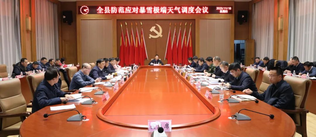 11月16日,县委书记徐宏君主持召开全县防范应对暴雪极端天气调度会议。他强调,要充分认清这次暴雪极端天气的严峻性和防灾减灾救灾工作的紧迫性,把防范应对暴雪极端天气工作作为当前头等大事来抓,树牢风险意识、极限思维,迅速启动应急响应机制,实行“五停”措施,全力保畅通、保运行、保民生、保稳定、保安全,确保城乡安全平稳运行、社会大局和谐稳定。