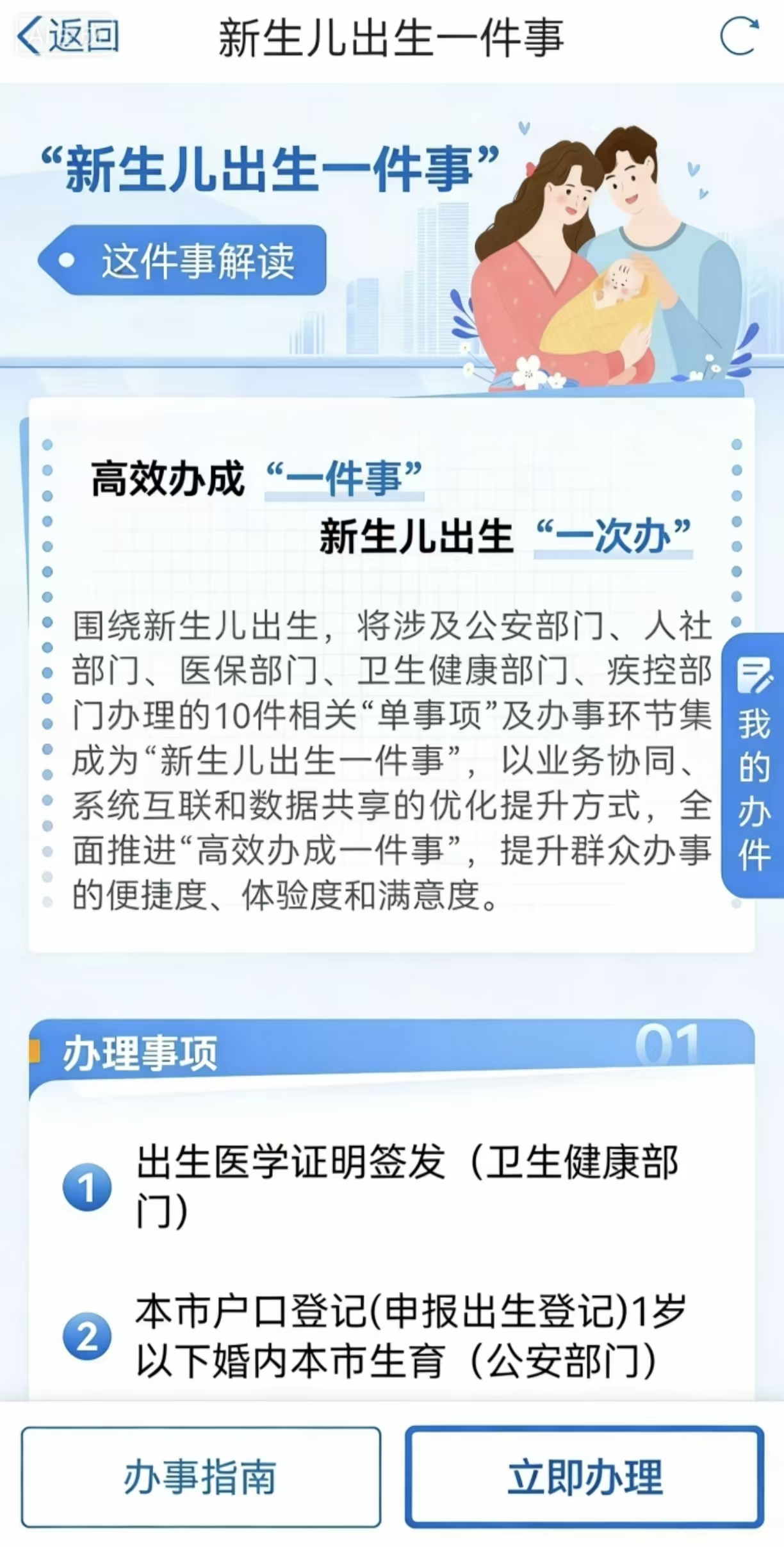 围绕新生儿出生,将涉及公安部门、人社部门、医保部门、卫生健康部门、疾控部门办理的10件相关“单事项”及办事环节集成为“新生儿出生一件事”,以业务协同、系统互联和数据共享的优化提升方式,全面推进“高效办成一件事”,提升群众办事的便捷度、体验度和满意度。