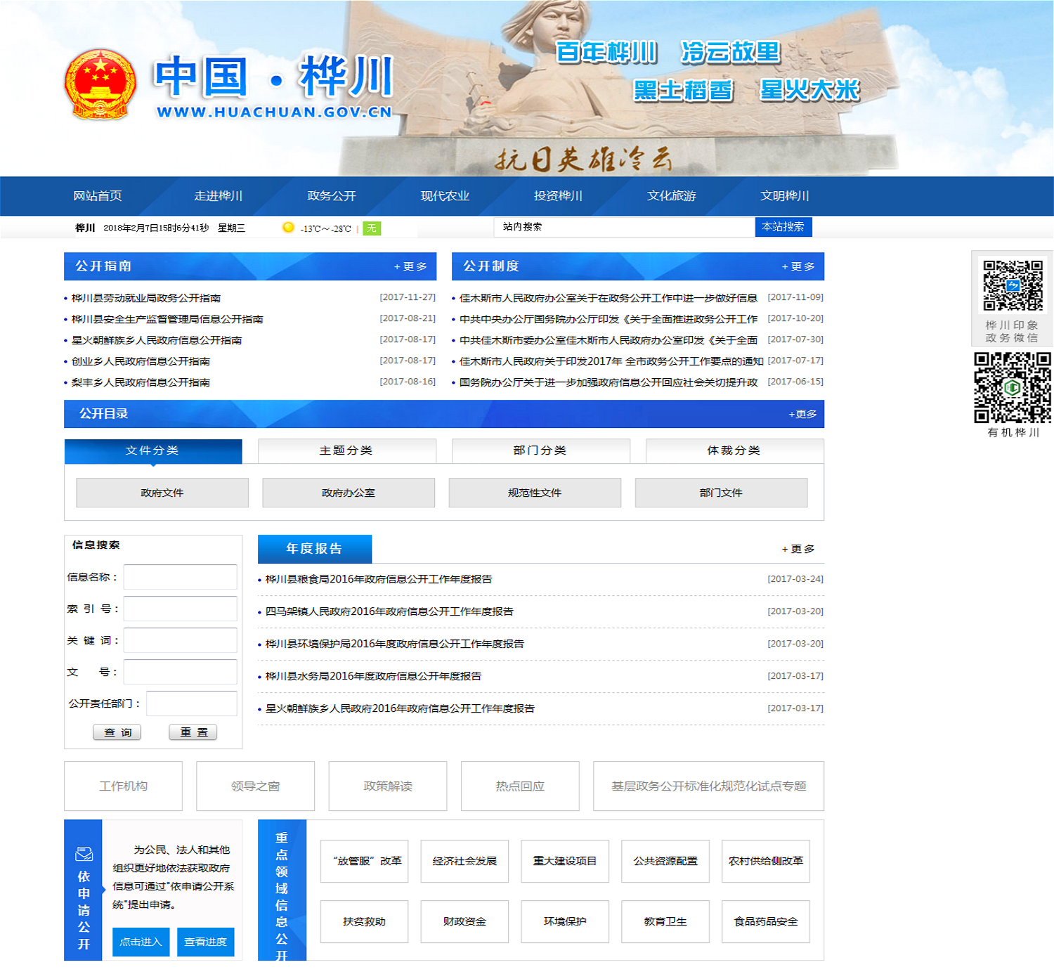 (二)突出平台建设,政务公开服务不断优化。全面升级改版桦川政府信息公众网政务公开页面,不断完善全县统一的政府信息公开目录体系和数据库,推进主动公开内容和目录体系建设。统筹规范栏目设置,充实完善规范性文件、“放管服”改革、基层政务公开标准化规范化、依申请公开等15个专栏,信息更加全面。同时,加强政策解读回应民众关切。开设互动参与栏目,设有调查问卷、民意征集、群众留言、领导信箱等专栏,群众反映的问题得到及时有效解决。增设热点回应栏目,针对涉及民生工程、城乡建设、社会救助等公众关切问题,做好舆情收集、研判、处置和回应。设立政策解读专栏,公开政策解读信息,第一时间向公众传递权威解读。